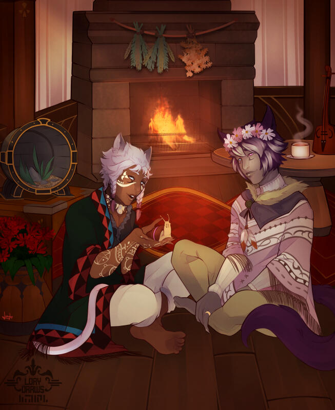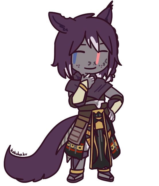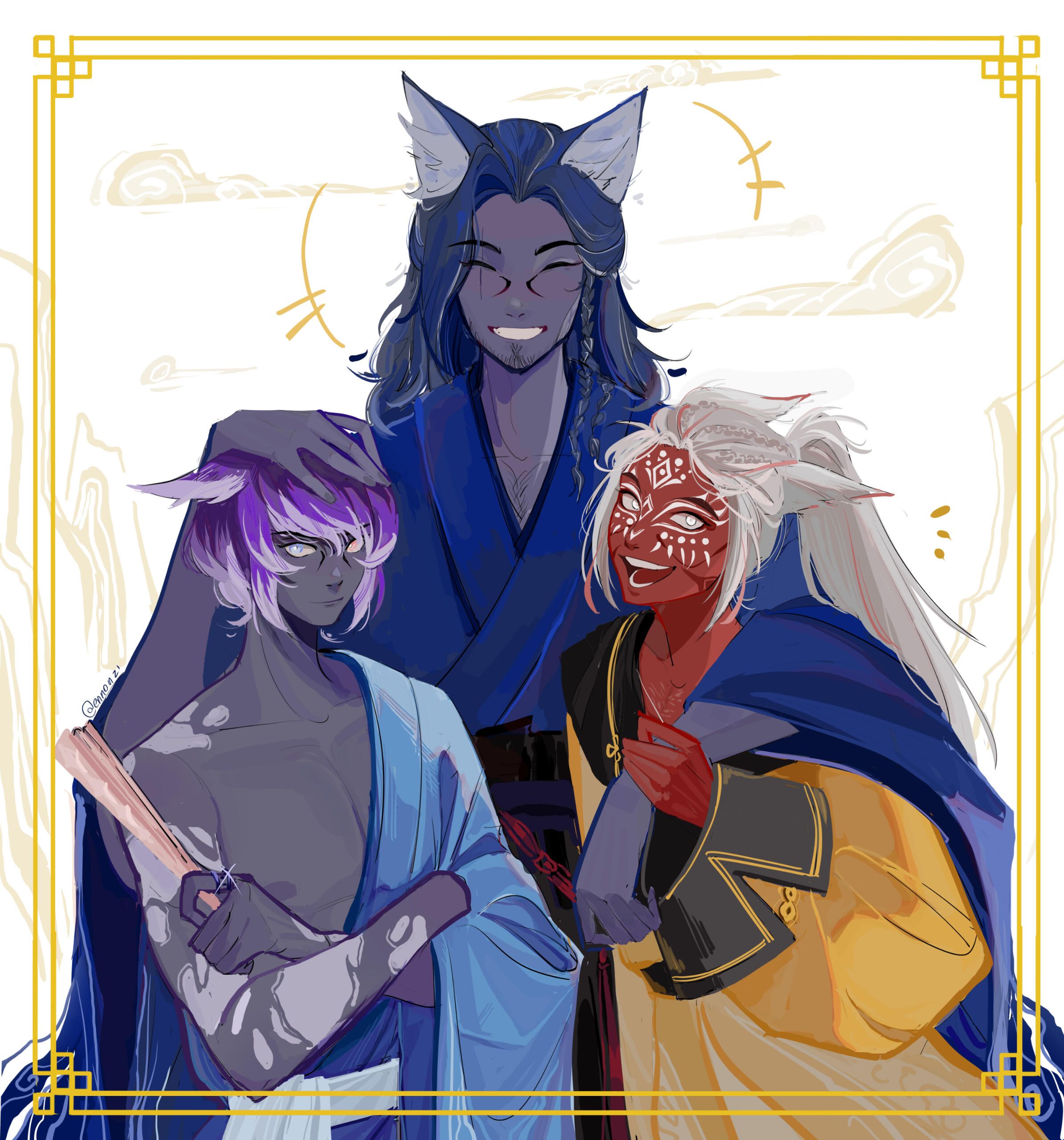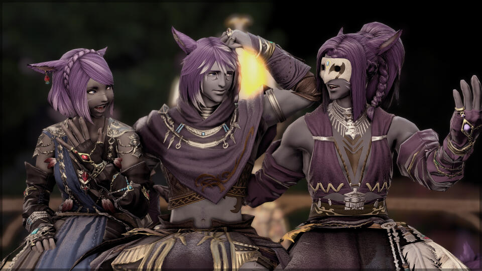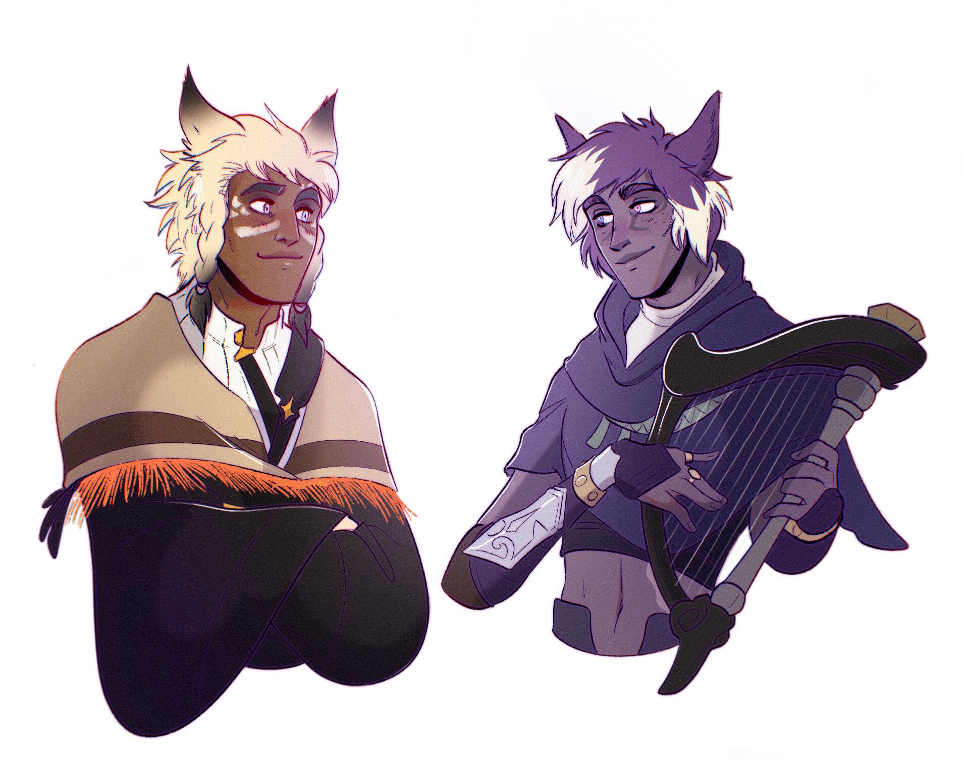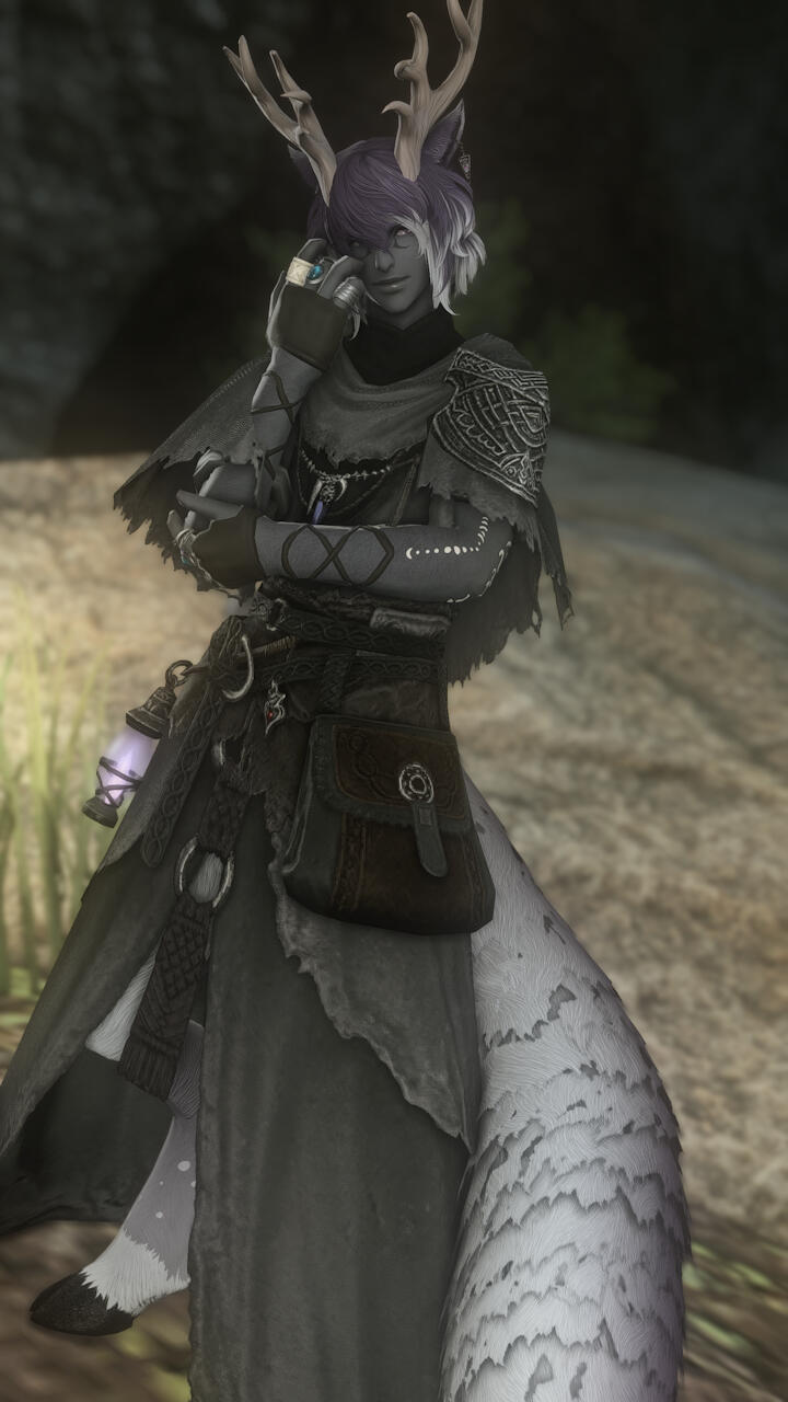 ♪ Born to Clan Tayuun, Ninka'ir is the youngest of eight. He was raised primarily by his older brothers, as his father left when he was yet an infant, and his mother was cruel and cold.♪ When he was just seventeen summers, a tragic accident led to the death of his older brother Ninka'sae. Wracked with guilt, Ninka'ir fled to Gridania rather than face his family again, where he was exposed to the world outside of their clan for the first time.♪ In Gridania, he met Deommant, an officer of the Twin Adders, and the two fell in love. However, not long after they were together, Deommant's mask began to slip, and reveal the cruelty underneath. Eventually, this would escalate to Deommant trafficking Ninka'ir for profit, until one day, Ninka'ir stole the gil and bought a one-way ticket to Kugane, where he could escape Deommant and start a new life.♪ In Shirogane, he'd find his way to NightRaid, a bounty hunting company that took in similarly wayward souls. It was there he'd find his future husband and his future family. He remains with NightRaid to this day, given fertile soil with which to grow, and help others do so as well. He would even one day reconnect with his siblings, and find their love rekindled.♪ However, Ninka'ir would not escape Deommant forever. Little did he know, in the shadows, Deommant was making plans. No longer content to take advantage of one naïve miqo'te, Deommant devised a scheme to capture hundreds of Keepers and use them as livestock in an insane bid for power. Together with NightRaid, Ninka'ir put an end to Deommant once and for all, but in the process of doing so, burnt through the flame of his life's candle.♪ With determination (and some divine intervention) Ninka'ir was brought back from death's door, but not without certain consequences. He returns to life as a faun, a type of fae eternally bound to the grove where he was resurrected.♪ With a second chance at life and a new condition to explore, Ninka'ir continues to enjoy all the beauty that this star has to offer, and hunt down any who would threaten it.