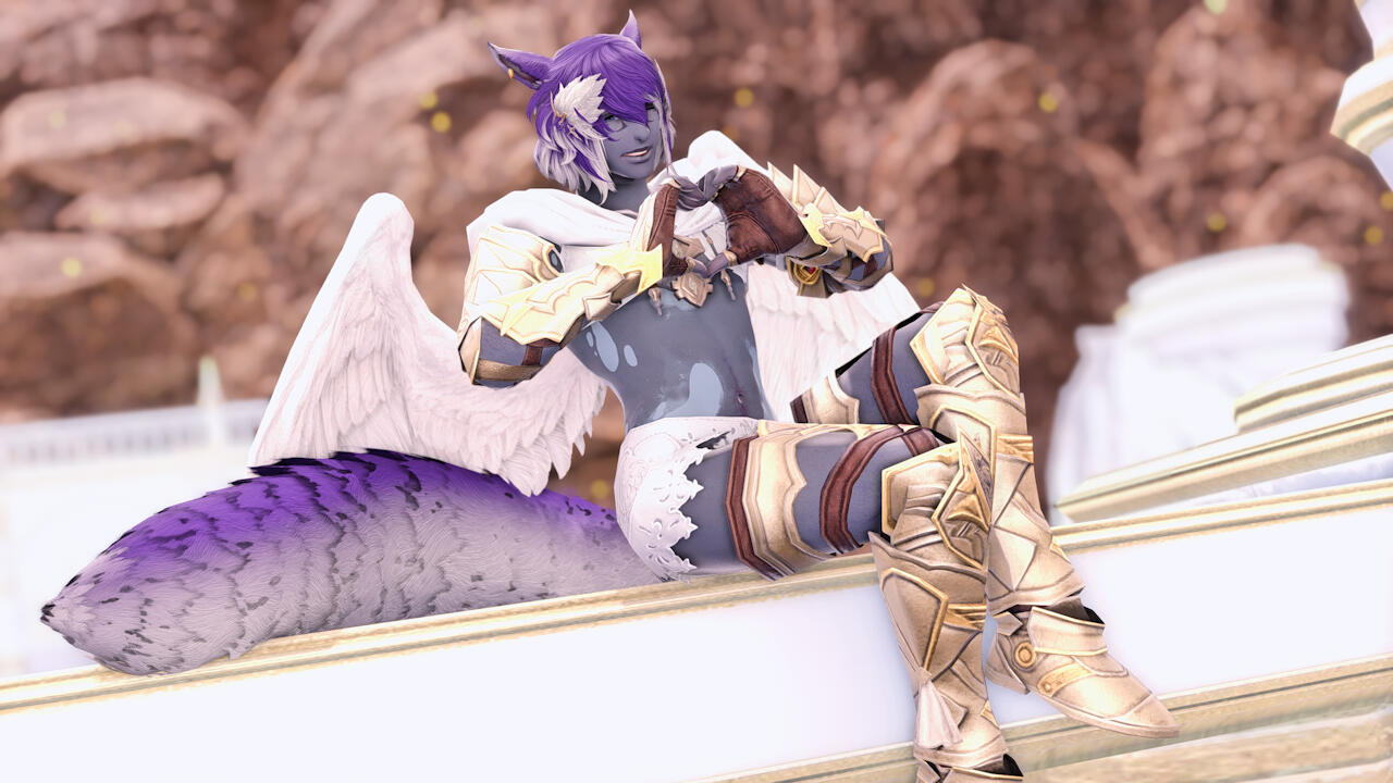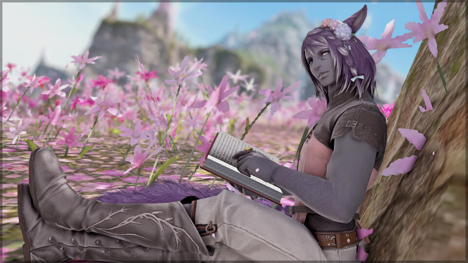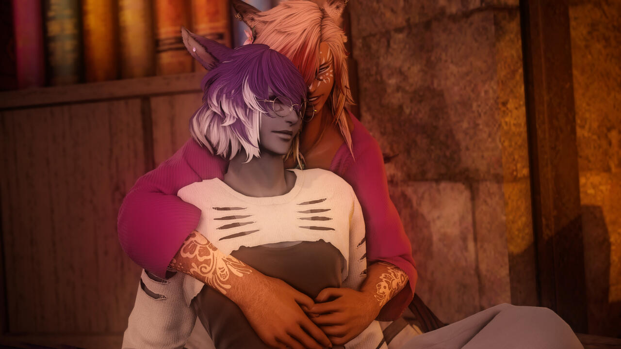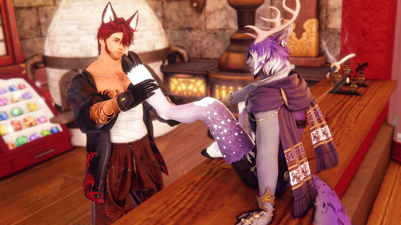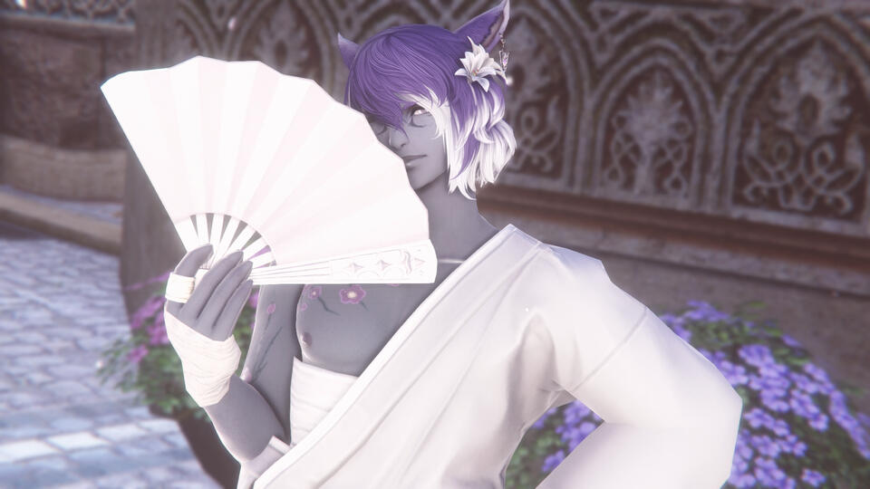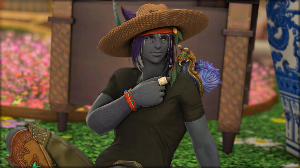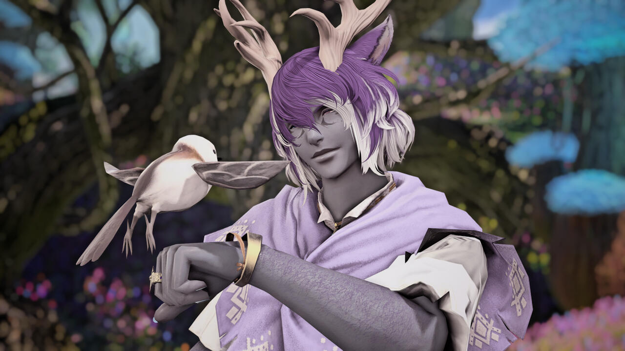♪ Born to Clan Tayuun, Ninka'ir is the youngest of eight. He was raised primarily by his older brothers, as his father left when he was yet an infant, and his mother was cruel and cold.♪ When he was just seventeen summers, a tragic accident led to the death of his older brother Ninka'sae. Wracked with guilt, Ninka'ir fled to Gridania rather than face his family again, where he was exposed to the world outside of their clan for the first time.♪ In Gridania, he met Deommant, an officer of the Twin Adders, and the two fell in love. However, not long after they were together, Deommant's mask began to slip, and reveal the cruelty underneath. Eventually, this would escalate to Deommant trafficking Ninka'ir for profit, until one day, Ninka'ir stole the gil and bought a one-way ticket to Kugane, where he could escape Deommant and start a new life.♪ In Shirogane, he'd find his way to NightRaid, a bounty hunting company that took in similarly wayward souls. It was there he'd find his future husband and his future family. He remains with NightRaid to this day, given fertile soil with which to grow, and help others do so as well. He would even one day reconnect with his siblings, and find their love rekindled.♪ However, Ninka'ir would not escape Deommant forever. Little did he know, in the shadows, Deommant was making plans. No longer content to take advantage of one naïve miqo'te, Deommant devised a scheme to capture hundreds of Keepers and use them as livestock in an insane bid for power. Together with NightRaid, Ninka'ir put an end to Deommant once and for all, but in the process of doing so, burnt through the flame of his life's candle.♪ With determination (and some divine intervention) Ninka'ir was brought back from death's door, but not without certain consequences. He returns to life as a faun, a type of fae eternally bound to the grove where he was resurrected.♪ With a second chance at life and a new condition to explore, Ninka'ir continues to enjoy all the beauty that this star has to offer, and hunt down any who would threaten it.
